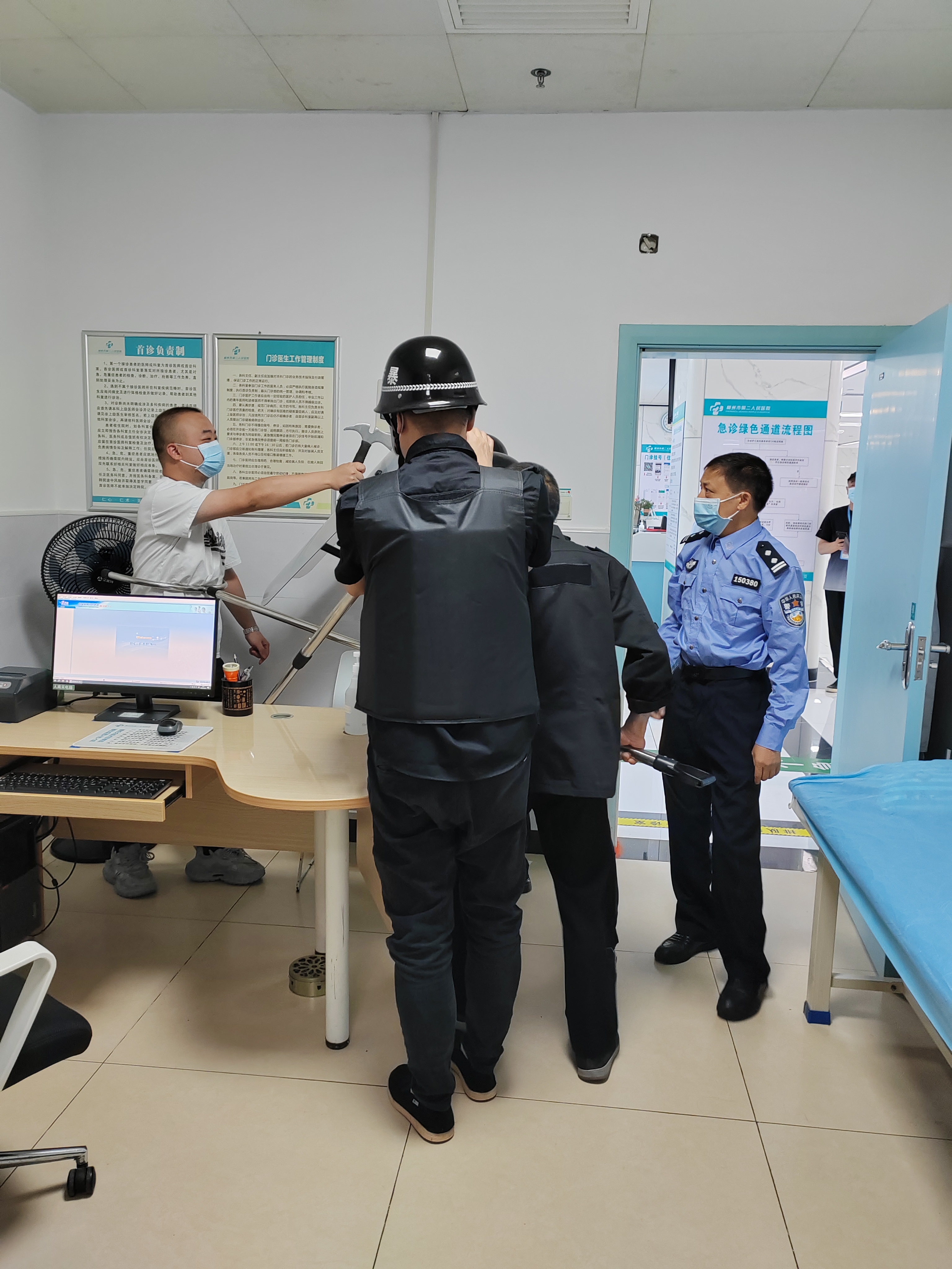 此次演练特邀社区片警指导,医院总务(保卫)科、门急诊等多部门协同参与,模拟“一名不明身份人员携带危险物品闯入门诊大厅,情绪激动并威胁在场医患”的突发场景。上午9时许,门诊大厅安保人员第一时间发现“险情”,立即向医院总务(保卫)科报告,同步迅速疏散周边就诊群众,同时尝试与“歹徒”沟通周旋,稳定其情绪。